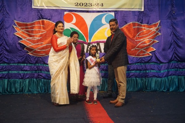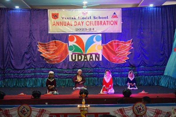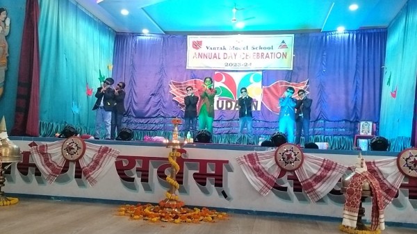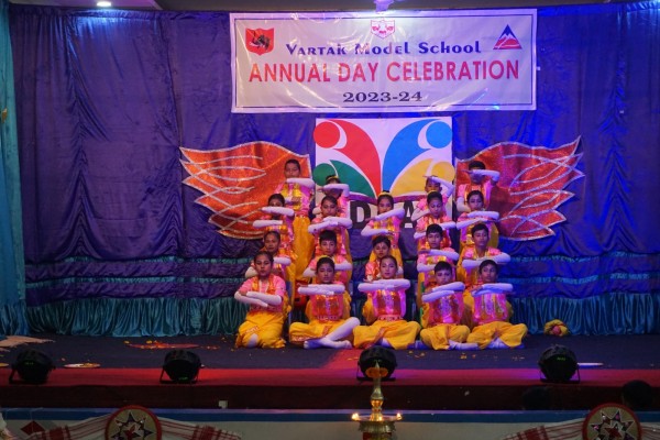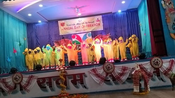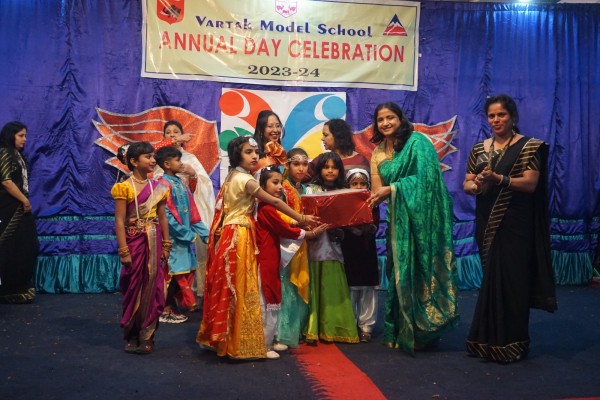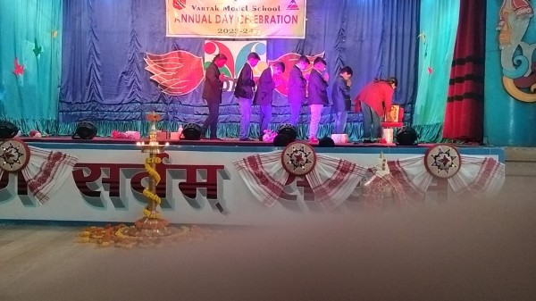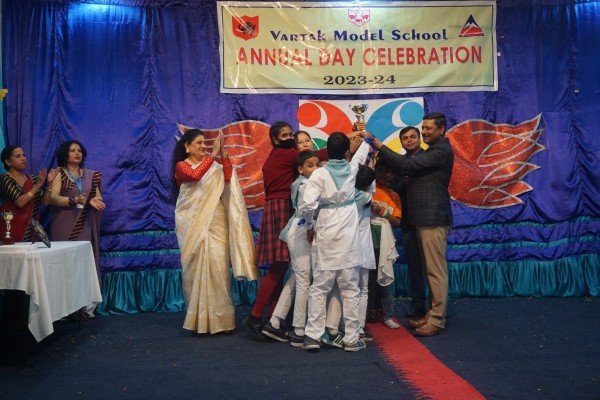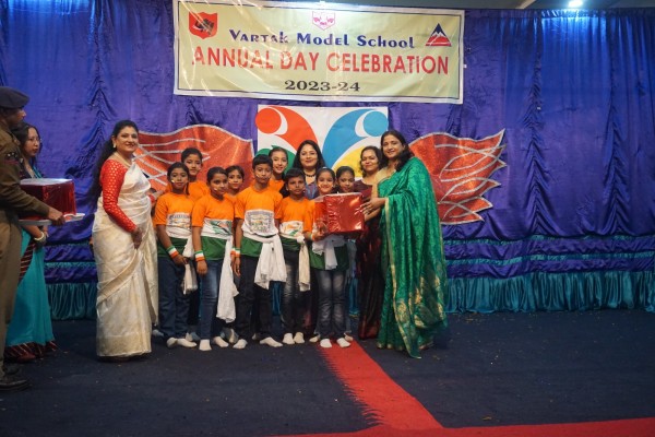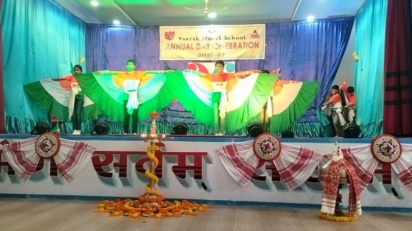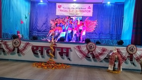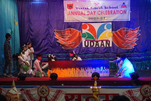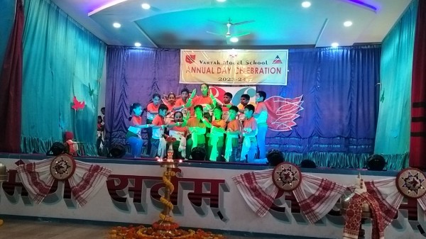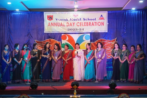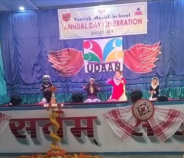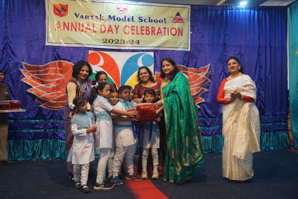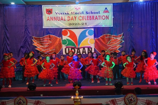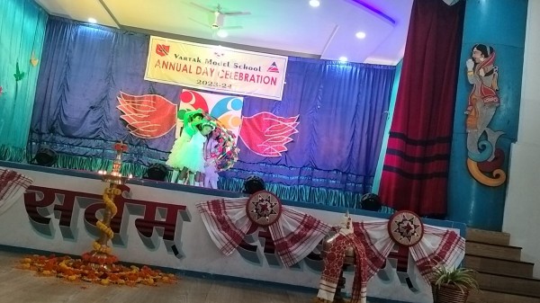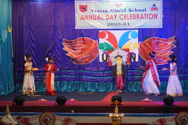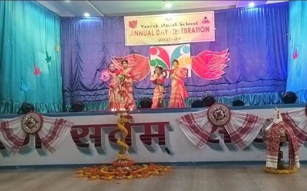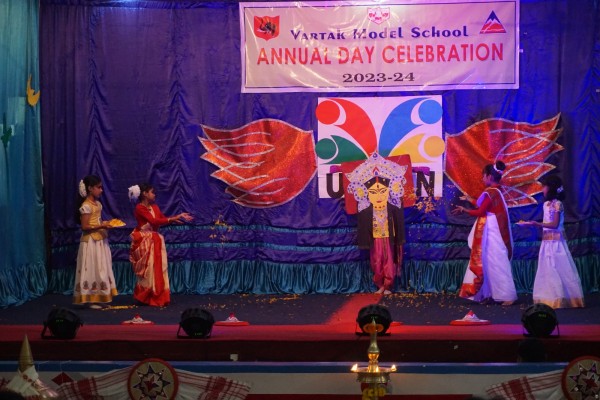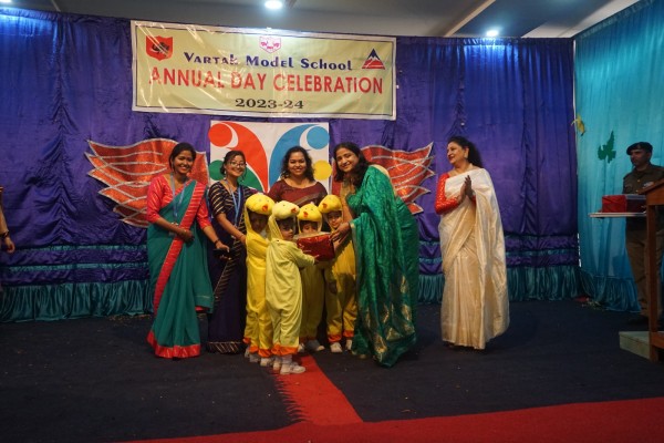 Vartak Model School celebrated Annual day on 3rd February 2024 at Mani Bhawan.The Stage and the function premises were beautifully decorated specifying the theme of the function, which resembled the name “Udaan”. Brigadier Raman Kumar SV,Chief Engineer , Patron, Vartak Model School,and Mrs GS Anitha, Hony Director, Vartak Model School were Welcomed as the Chief Guests of the Annual Day celebration of the School. Along with them, other dignitaries and committee members of the school were also present at the function. Parents of all the students were invited to the Annual function. The chief guest were welcome with a traditional Assamese gamusa by the students.The momentous occasion commenced with the lighting of the ceremonial lamp by the chief Guest . After that the principal Mrs JonaliTalukdar Sharma presented the school report highlighting the achievements of the school in various domains. Over 165 students from pre-primary and primary classes participated in the cultural programme which began with a Ganesh/Saraswati/Krishna Vandana. Following that, one after the other, there were marvellous dance performances from the students, from classes Nursery to 5. After that, adding flavor to the function, there was a group song performed by the teachers. As the function came to an end, there was a patriotic dance performance. It was simply amazing, and all the pieces of efforts taken by the students paid off, resulting in loud applause from everyone on the premises. Mrs G S Anitha, Hony Director ,distributed prizes to the performer and Brig Raman Kumar SV,Patron distribute prizes to Maximum attendance,the best performers and also to the Best House of the year and BestHouse in Sports trophy to the students along with teachers.Both the trophy were won by Red Roses. He also praised the school for its dedicated service to education and the efforts made by our school in preparing the students for the annual day function in very short span.After this, the co ordinator Mrs Mridusmita Borah thanked all the Chief Guests, management committee and other dignitariesfor giving their valuable time for the School function.She also addressed all the students and their parents, congratulating each and everyone from the school, for every effort taken to make this function successful. The function closed with the singing of the National Anthem. The celebration ended after a high tea and refreshment were served to the students and parents.