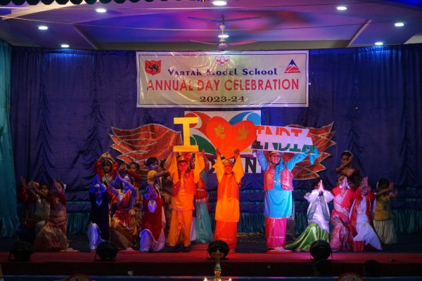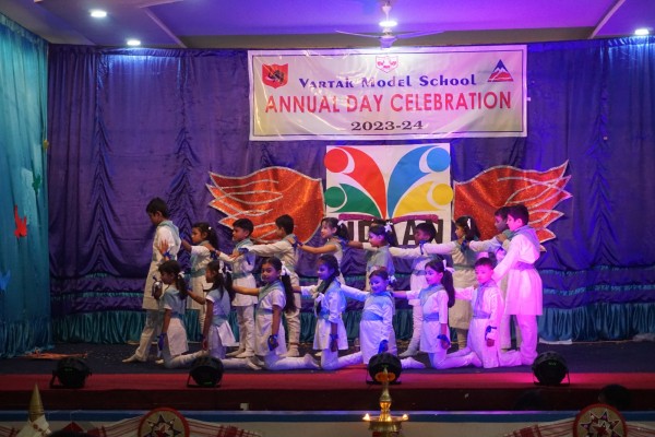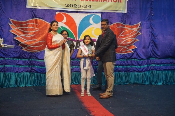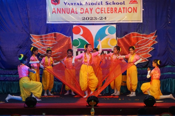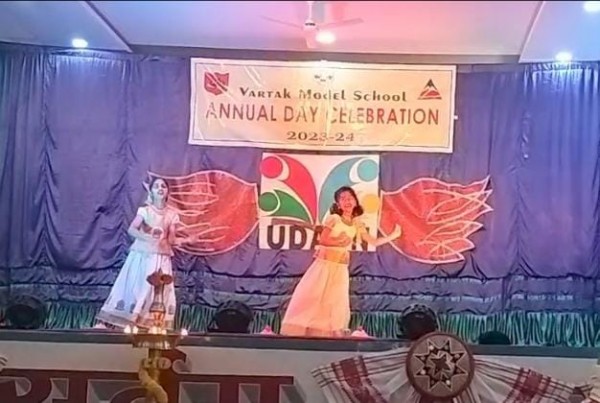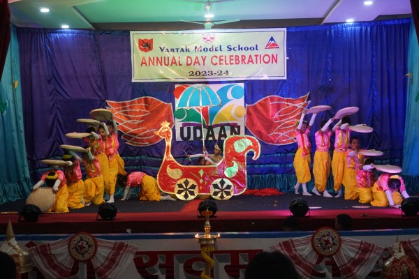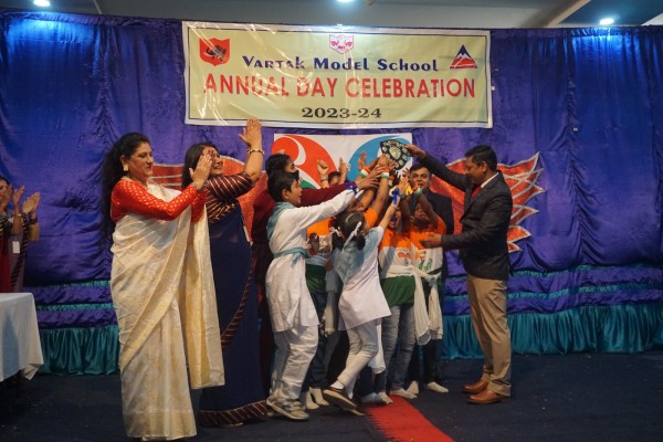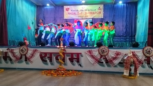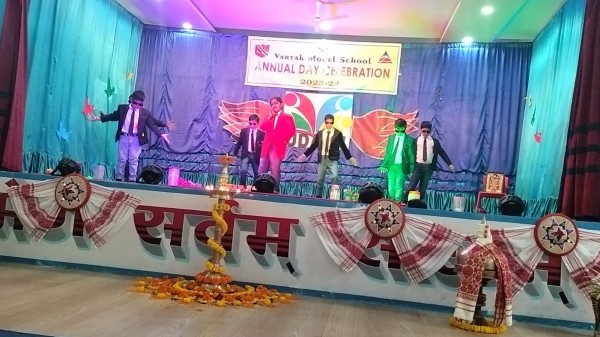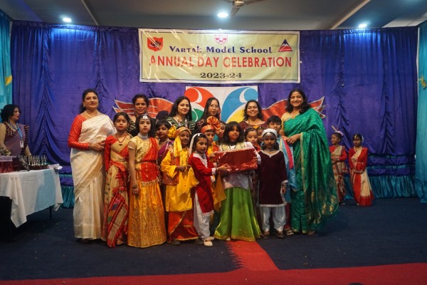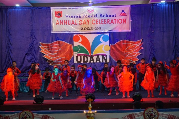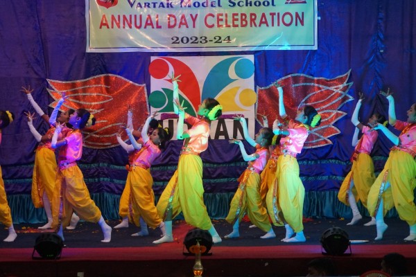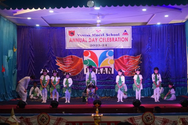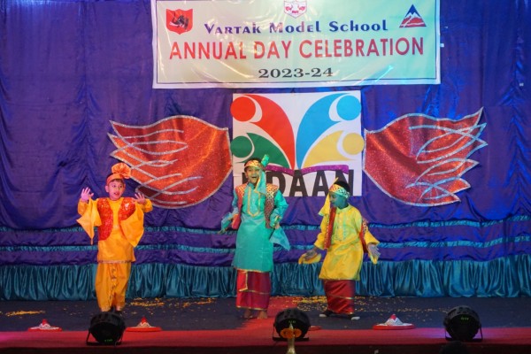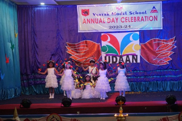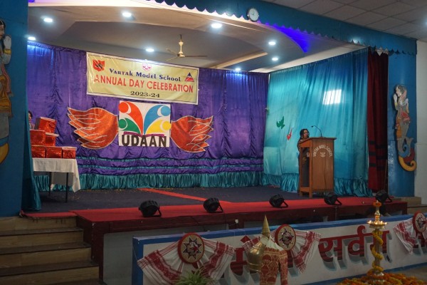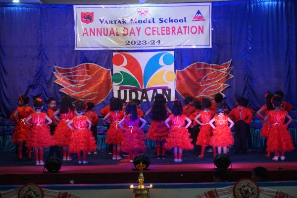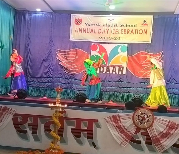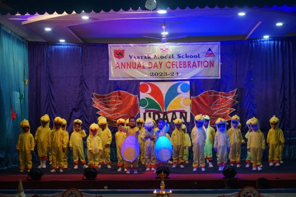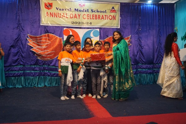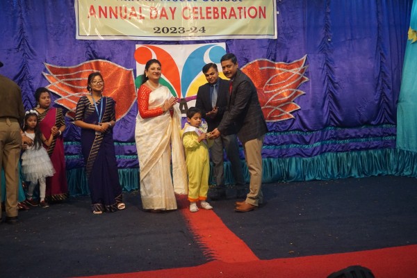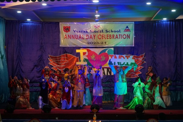 Vartak Model School celebrated Annual day on 3rd February 2024 at Mani Bhawan.The Stage and the function premises were beautifully decorated specifying the theme of the function, which resembled the name “Udaan”. Brigadier Raman Kumar SV,Chief Engineer , Patron, Vartak Model School,and Mrs GS Anitha, Hony Director, Vartak Model School were Welcomed as the Chief Guests of the Annual Day celebration of the School. Along with them, other dignitaries and committee members of the school were also present at the function. Parents of all the students were invited to the Annual function. The chief guest were welcome with a traditional Assamese gamusa by the students.The momentous occasion commenced with the lighting of the ceremonial lamp by the chief Guest . After that the principal Mrs JonaliTalukdar Sharma presented the school report highlighting the achievements of the school in various domains. Over 165 students from pre-primary and primary classes participated in the cultural programme which began with a Ganesh/Saraswati/Krishna Vandana. Following that, one after the other, there were marvellous dance performances from the students, from classes Nursery to 5. After that, adding flavor to the function, there was a group song performed by the teachers. As the function came to an end, there was a patriotic dance performance. It was simply amazing, and all the pieces of efforts taken by the students paid off, resulting in loud applause from everyone on the premises. Mrs G S Anitha, Hony Director ,distributed prizes to the performer and Brig Raman Kumar SV,Patron distribute prizes to Maximum attendance,the best performers and also to the Best House of the year and BestHouse in Sports trophy to the students along with teachers.Both the trophy were won by Red Roses. He also praised the school for its dedicated service to education and the efforts made by our school in preparing the students for the annual day function in very short span.After this, the co ordinator Mrs Mridusmita Borah thanked all the Chief Guests, management committee and other dignitariesfor giving their valuable time for the School function.She also addressed all the students and their parents, congratulating each and everyone from the school, for every effort taken to make this function successful. The function closed with the singing of the National Anthem. The celebration ended after a high tea and refreshment were served to the students and parents.